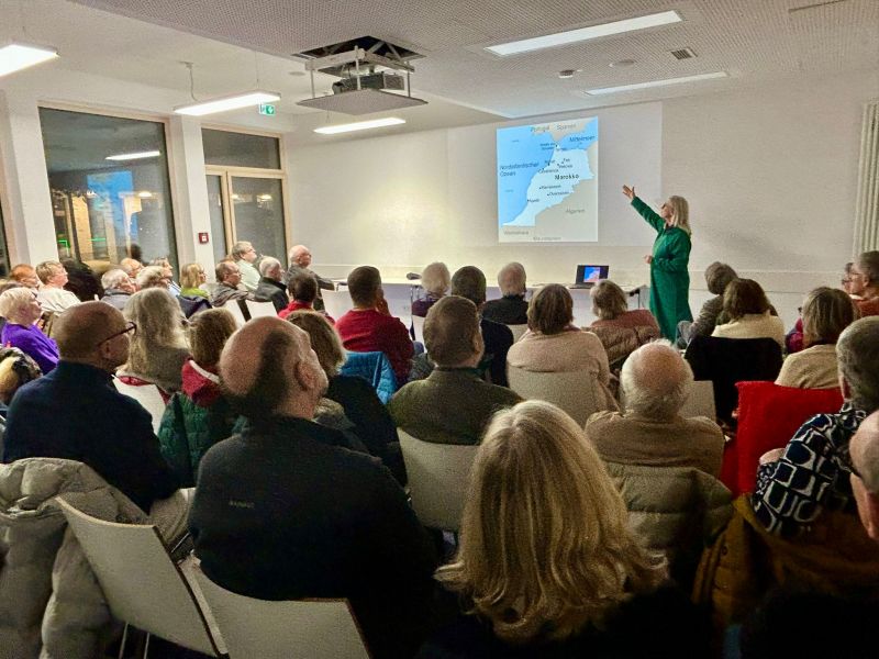 Am 19. Januar 2026 lud der Stadtteilverein Bahnstadt e. V. zum Mitgliedertreff ein. Es war nicht irgendein gewöhnlicher Mitgliedertreff, sondern ein ganz besonderer: Sigrid Zweygart-Pérez – gekleidet in eine Jellaba[1] –berichtete vor etwa 60 Menschen an diesem Abend über ihren 4-monatigen Aufenthalt in Marokko. Marokko zeichnet sich aus durch Religionsvielfalt friedlichen Miteinanders an der Kreuzung zwischen Europa, Afrika und der westlichen Welt.
