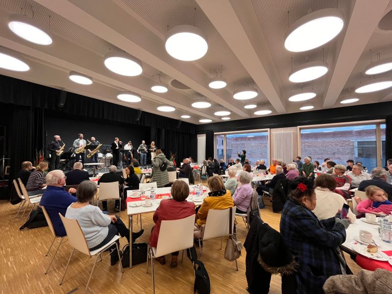 Für süße Genüsse war reichlich gesorgt: Es gab wieder duftende Waffeln und hausgemachten Kuchen. Die Helferinnen am Waffeleisen und viele fleißige Hände brachten die frischen Köstlichkeiten direkt an die Tische und verwöhnten die Gäste mit herzlichem Service. Über 100 Besucher*innen waren gekommen – Jung und Alt genossen den gemütlichen Nachmittag gleichermaßen. Nach ihren Auftritten mischten sich die Musikerinnen und Musiker unter die Anwesenden und ließen sich die Leckereien ebenfalls schmecken.