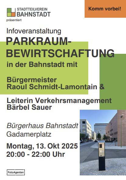 Deshalb wollen wir als Bahnstadtverein mit Ihnen dieses aktuelle Thema diskutieren und haben am Montag den 13.10. um 20:00 Uhr den Themenabend „Parkraumbewirtschaftung in der Bahnstadt“ mit unserem Bürgermeister für Klimaschutz, Umwelt und Mobilität, Raoul Schmidt-Lamontain und Bärbel Sauer, Leiterin des Amts für Verkehrsmanagement, organisiert. Die Veranstaltung findet im Bürgersaal (1. OG) statt.