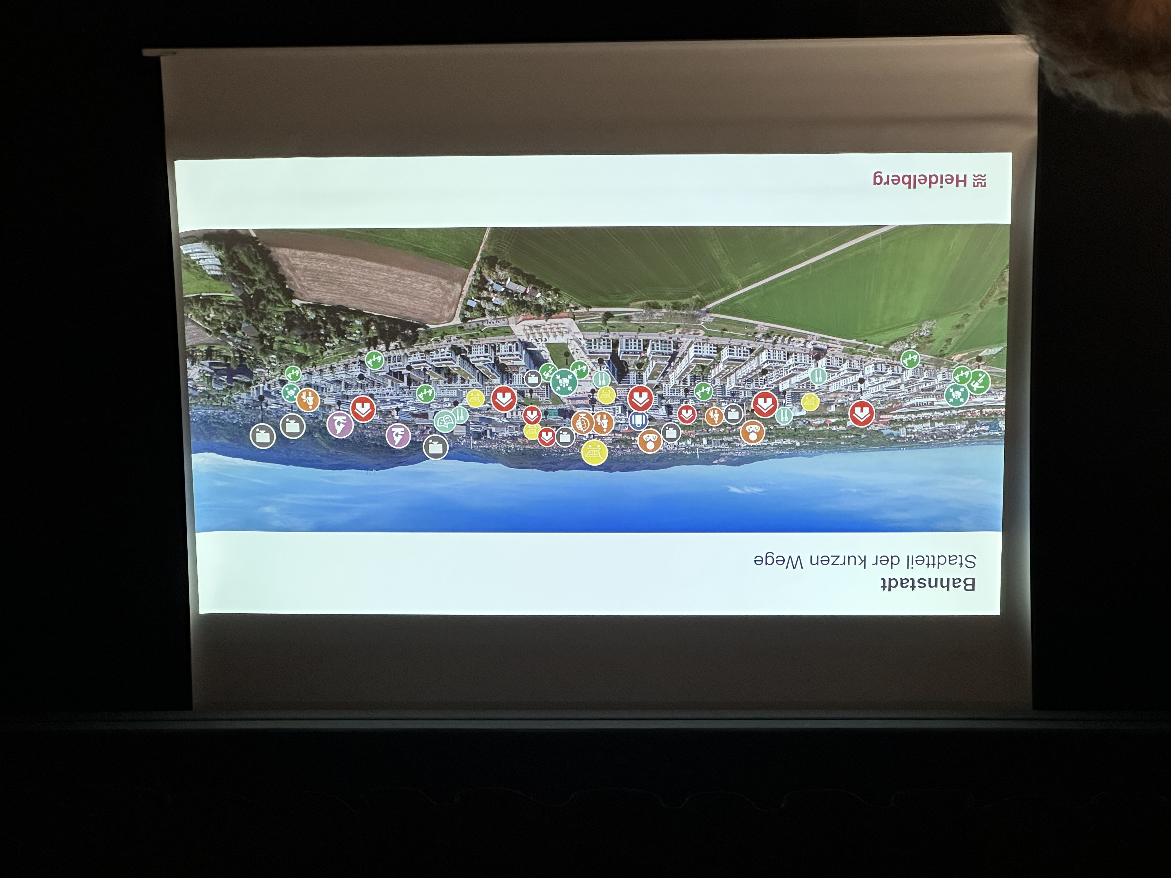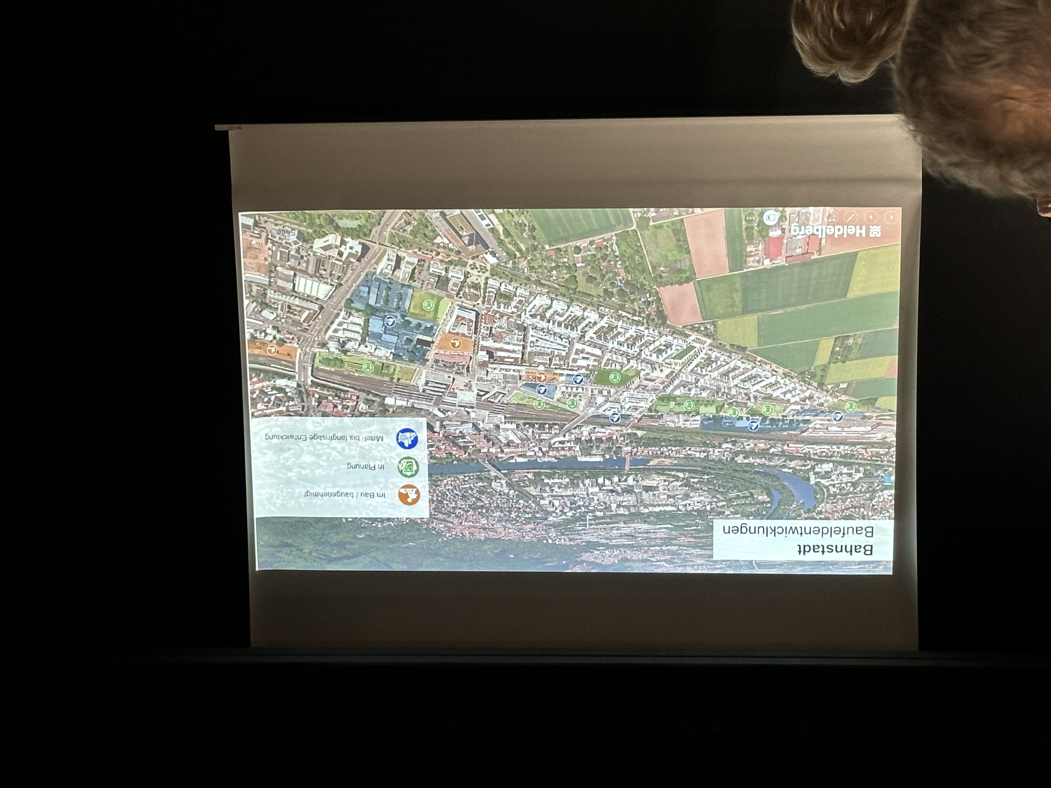 Herr Plöhn zeigte anhand einer aussagekräftigen PowerPoint-Präsentation die chronologische Entwicklung der Bahnstadt von der ursprünglichen Wettbewerbsausschreibung in den 1990er Jahren, an der 158 Architektenbüros teilgenommen hatten, über die Nominierung des Gewinners und Annahme des Rahmenplans im Jahr 2001 bis zur fortlaufenden Konkretisierung und Qualifizierung der Rahmenplanung zwischen 2007 und 2025. Der einstige Güterbahnhof mit den vielen Gleisen und Weichen spiegelt sich in der Planung der Straßenverläufe wider. An den Stellen, an denen die Straßenzüge spitz zulaufen, befanden sich einst Weichen. Das ab 2008 entstandene Baugelände wurde primär mit Passivhäusern ausgestattet. Außerdem war der neue Stadtteil einst als autoarmer Stadtteil konzipiert unter dem städtebaulichen Leitbild „Die Stadt der kurzen Wege“, wie Herr Plöhn erläuterte. Herr Plöhn zitierte eine Statistik, nach der die Bahnstadt nur 20% des Wärmeverbrauchs eines vergleichbaren Heidelberger Stadtteils aufweist, was auf die konsequente Passivbauweise zurückzuführen sei.