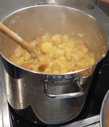 Jedes Jahr wird in der kalten Jahreszeit für Bedürftige „Was Warmes im Winter“ in verschiedenen Stadtteilen angeboten. Seit ein paar Jahren macht auch die Bahnstadt mit. Sigrid koordiniert die Termine und hilft beim Kochen und bei der Essensausgabe. Petra sorgt für ein starkes Team und Matthias, unser Koch, bringt die Rezeptideen und Zubereitungsschritte mit. Unser jüngstes Schnibbel-Mitglied geht gerade in die 9. Klasse, unser Ältestes ist über 80 Jahre alt. In fast gleicher Besetzung, ergänzt um Heike, Ingolf, Ursula und Sigrid traf sich das Team am nächsten Morgen, um den Kartoffelstampf frisch zuzubereiten, das Gemüse war ja glücklicherweise schon am Vortag küchenfertig hergerichtet.