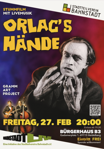 Am Freitag, 27.02.2026 lädt BahnstadtLive herzlich ins Bürgerhaus Bahnstadt ein zu einem Stummfilmabend mit Live Musik. Gezeigt wird der expressionistische Klassiker „ORLACS HÄNDE“ von Robert Wiene, aus dem Jahr 1924 – einer der ersten Horrorfilme überhaupt.