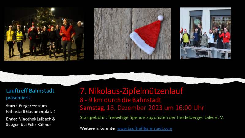 Mehrere Nikoläuse werden mitlaufen. Wir treffen uns vor dem Bürgerzentrum am Gadamer Platz. Nach 8 -9 km durch die Bahnstadt lassen wir uns den Winzerglühwein bei Felix (Vinothek Laibach & Seeger) schmecken. Voraussichtlich bringen einige Teilnehmer auch Plätzchen, Kuchen oder Käsegebäck mit.